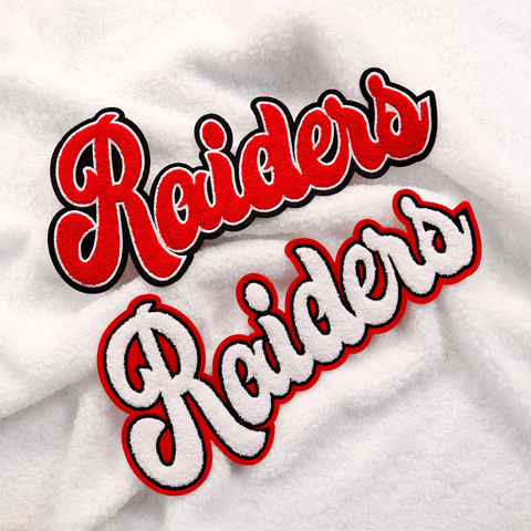 Parches bordados de chenilla de alta calidad, venta al por mayor, apliques de tela roja, decoración de ropa, bordado de toalla con letras en blanco personalizado